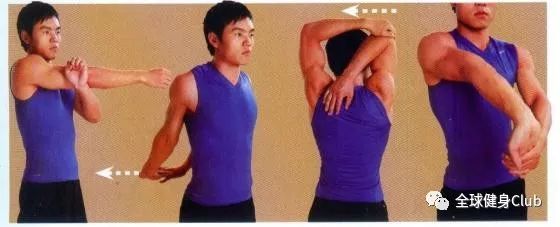1、一手伸直,抬起和肩一样高,另一手弯曲肘部,用前臂往回拉伸直的手。左右交替1~2次,每次大概10秒。