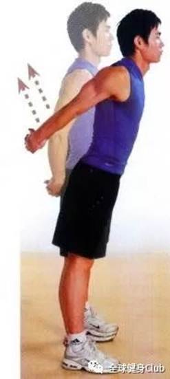 分开双脚和肩一样宽,双手往后交叉相握后尽量伸开。手臂高度不同,刺激的部位也不一样。可以每个部 位拉伸20-30秒,也可以按照练习的需要,重点拉伸某个部位。