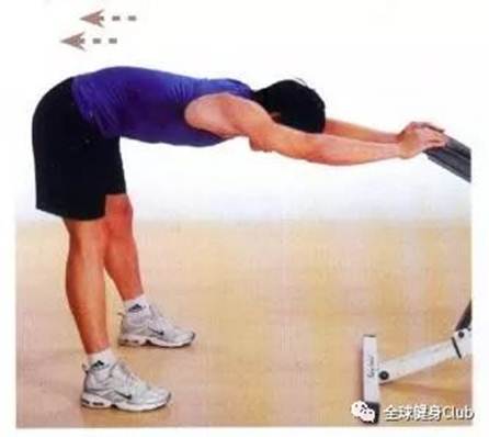 分开双脚比肩宽,上身前屈,双手伸直拉住固定物,臀部往后用力,拉伸背部。拉伸20到30秒,或者按照练习的需要进行拉伸。