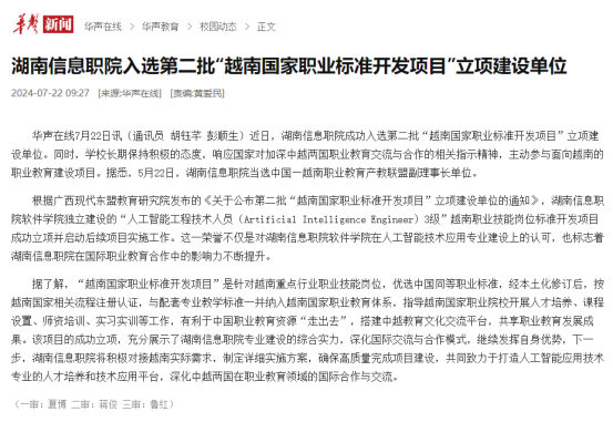 7月22日,华生在线发布《湖南信息职院入选第二批“越南国家职业标准开发项目”立项建设单位》