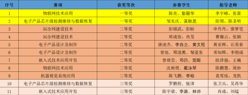 3月5日,2023年度“楚怡杯”湖南省职业院校技能竞赛圆满收官。湖南信息职院电子工程学院师生参加了“5G全网建设技术”、“物联网技术应用”、“电子产品芯片级检测维修与数据恢复”、“电子产品设计及制作”、“嵌入式技术应用开发”、“机器视觉系统应用”、“工业机器人技术应用”等7个赛项的激烈角逐,每个赛项均摘得奖牌,获奖率100%!共计获奖14项,其中一等奖3项,二等奖7项,三等奖4项。