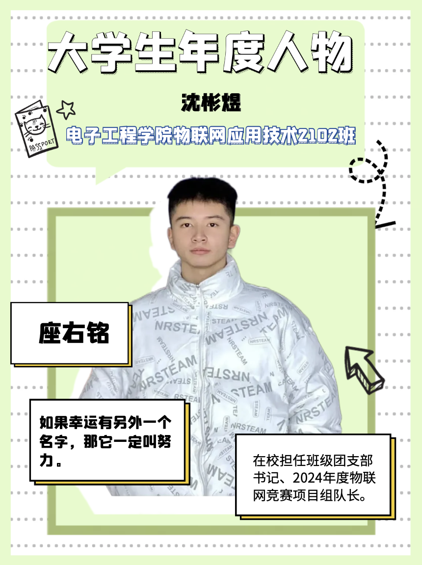 “如果幸运有另外一个名字,那它一定叫努力。”这句话如灯塔般为沈彬煜指明了前行的方向。在校期间,沈彬煜的专业课程成绩卓越,所有课程分数超90分,16门必修课平均分超95分,且在大二学年总成绩排名第一。此外,在2024年度“楚怡杯”湖南省职业院校技能竞赛中,他凭借出色的表现荣获高职高专组物联网技术应用赛项一等奖,充分展现了他在技术领域的深厚实力。正是他积极认真的学习态度,使他连续两年荣获国家励志奖学金。
