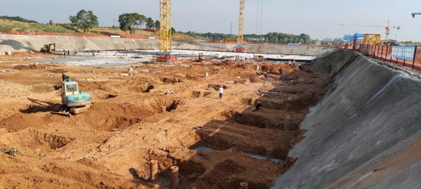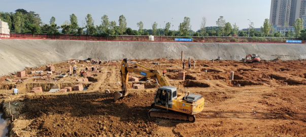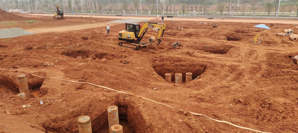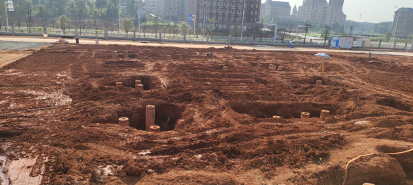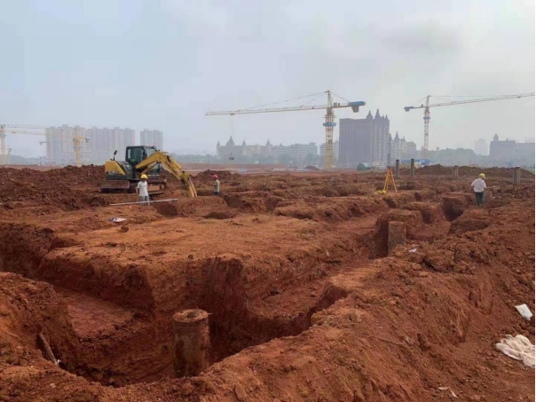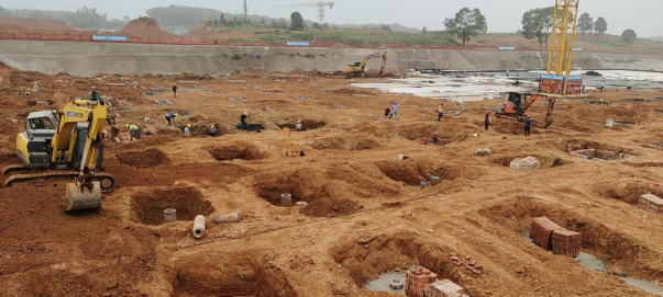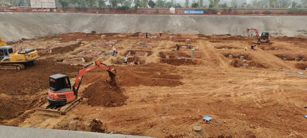 4. 7#栋:中栋桩基础土方开挖、垫层管桩完整试验(G-M轴)。(人材机配置:1台小挖机、1台大挖机,杂工抽水、管理人员合计:5人)