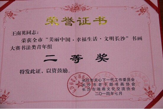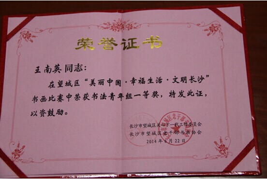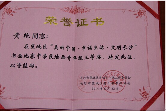 5月,best365官网师生参加了望城区关工委举办的“美丽中国、幸福生活、文明长沙”书画比赛,计算机工程系王南英老师荣获望城区青年书法组一等奖,荣获长沙市青年书法组二等奖;安博环艺1302班黄艳同学荣获青年绘画组三等奖,退休职工朱均安老师荣获老年绘画组优胜奖。特此祝贺!