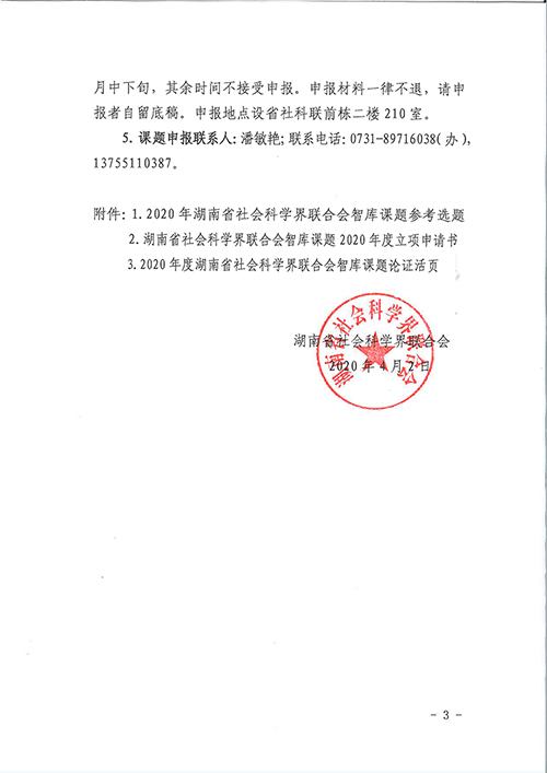 现将转发转发湖南省社会科学界联合会《关于做好2020年度湖南省社会科学界联合会智库课题申报工作的通知》转发给大家,有意申报的教师认真学习通知,了解智库课题申报要点,积极申报。