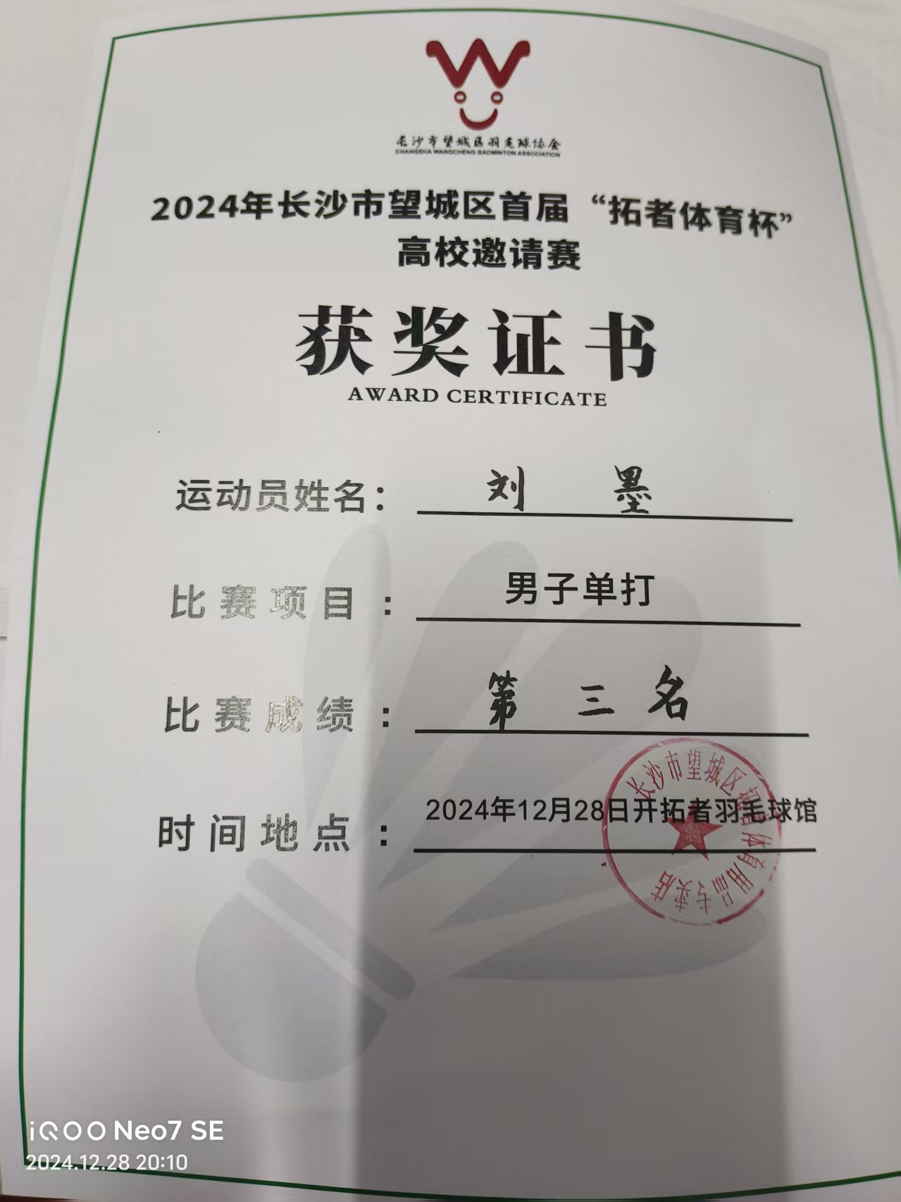 逐梦羽毛球场,绽放青春光芒。在校园里,他是一位闪闪发光的“资深”羽毛球爱好者。在校期间,他担任羽毛球协会会长一职,多次组织参与校运会和羽毛球比赛。在担任校羽毛球队队长兼助教时,他带领校队获得市级比赛二等奖2次,市级比赛个人单项第三名1次,优秀裁判员2次。他还凭借努力考取了羽毛球专项训练教练员证书,在自己喜欢且擅长的领域不断前行。