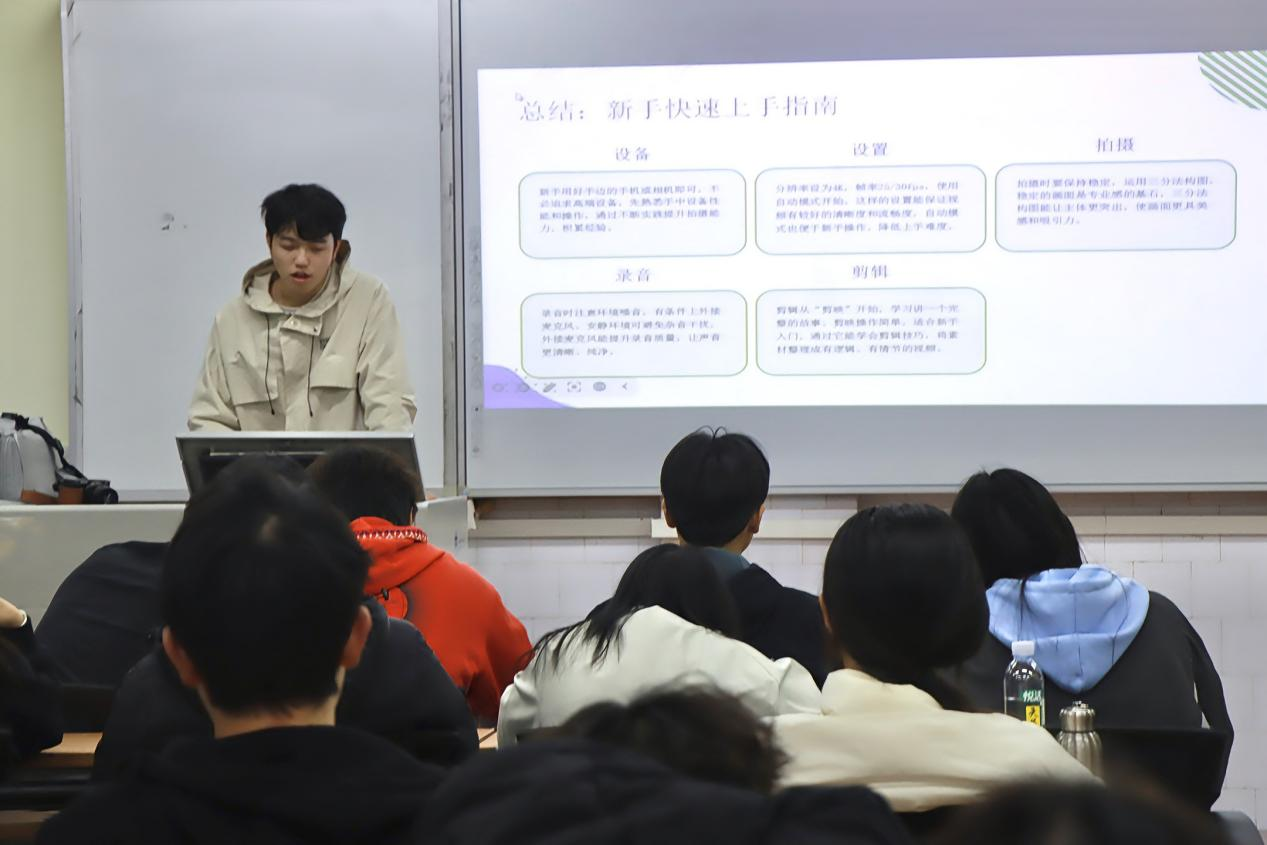 向文龙校友在校期间曾担任校大学生记者团摄影摄像组组长,获2023年度“湖南省高校优秀学生记者”荣誉称号。毕业后,在省内一所5A级景区担任高级摄影师,积累了丰富的实战经验。此次分享以“用镜头发现美好,以热爱赋能成长”为主题,引导同学们从日常能接触到的场景入手,无论是课堂学习、社团活动,还是校园风光、生活点滴,他都用通俗的语言讲解构图、光线、取景等基础技巧,通过对比“随手拍”与“用心拍”的案例,让大家直观感受摄影的魅力。针对同学们关心的“没有专业相机能不能拍好”“手机修图怎么快速出效果”等问题,他结合自身经验分享“多观察、多尝试、多总结”的实用方法,鼓励大家多用手机记录生活、表达自我。