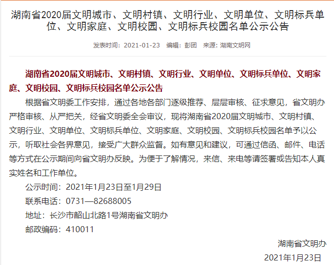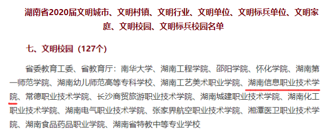 1月23日,湖南省文明办发布《湖南省2020届文明城市、文明村镇、文明行业、文明单位、文明标兵单位、文明家庭、文明校园、文明标兵校园名单公示公告》(公示期至29日),湖南信息职院入围省文明校园公示名单。这是继获评“长沙市文明校园”后,对学院文明创建工作全面的肯定和鼓舞。