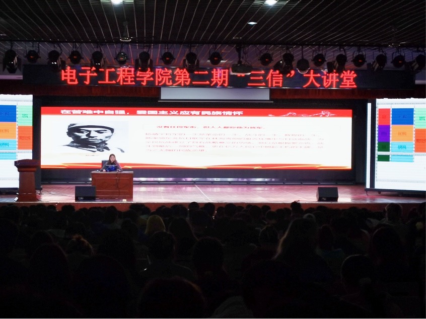 电子工程学院以“学党史”为基本点,以“强信念”为总开关,以“跟党走”为总目标,积极培养有信仰、有信心、有信用的“三信英才”,并通过课堂教学、“三信英才”大讲堂等方式将党史学习教育与育人工作相结合,积极推进党史学习教育取得实效。