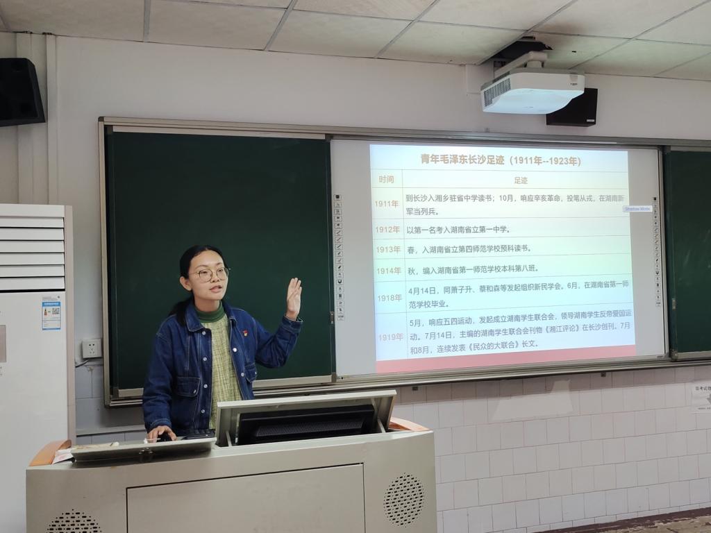 “听”,诗中党史。读书会上,人文素养教研室胡静老师对毛泽东《沁园春·长沙》一词进行讲解,挖掘其中的党史故事,她从青年毛泽东在长沙的足迹和诗词写作背景为立足点,讲述了青年毛泽东在在长沙求学和开展社会活动的峥嵘岁月。她强调,在长沙这片热土上,不仅印记着毛泽东等青年们伟岸的身影,更有着宝贵的精神财富。