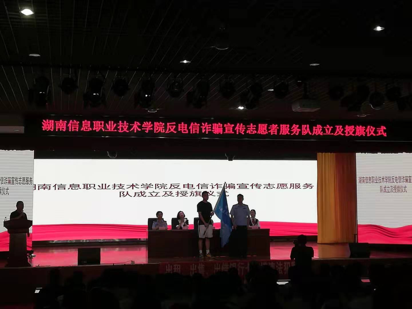 为加强防范电信网络诈骗宣传,充分发挥学生在防范电信网络诈骗宣传工作中的主观能动性,提升师生防骗、识骗能力,6月24日,best365官网联合长沙市公安局望城分局、中国银行旺旺支行举行了“湖南信息职院反诈宣传志愿服务队”成立及授旗仪式。