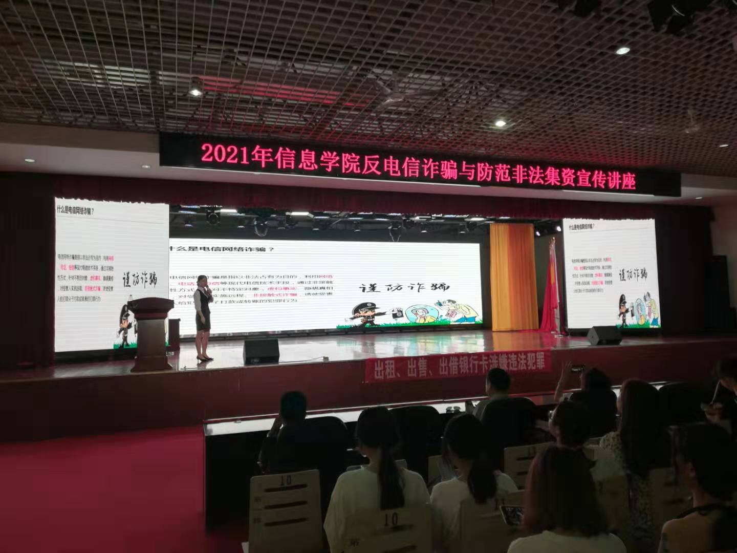 中国银行旺旺支行副行长李乐郴进行了“反电诈及防范非法集资”宣讲,提醒同学们积极配合公安机关相关工作,决不能因蝇头小利而将自己的电话卡和银行卡提供给诈骗分子,成为诈骗分子实施犯罪的通讯工具和资金通道。讲座中,广大师生认真听讲,积极回应,有效提高了对电信网络诈骗、非法集资的识别和防范能力。