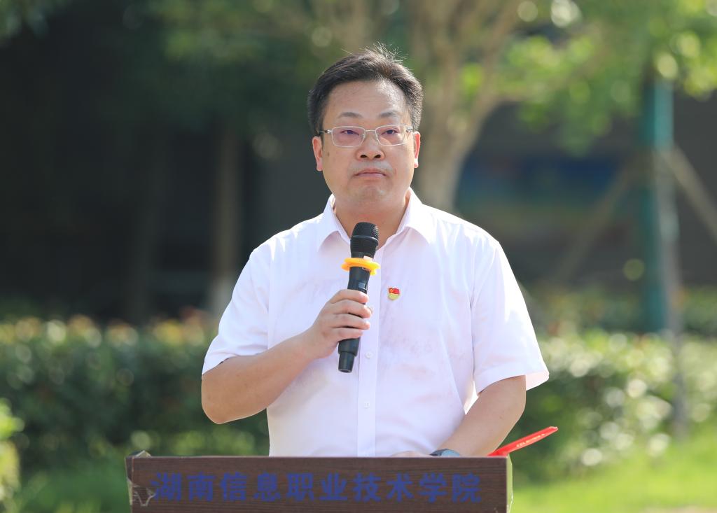 贺代贵作国旗下的讲话。他强调全体教职工积极弘扬伟大建党精神,始终牢记为党育人、为国育才的初心使命;要始终把师德师风作为评价教师的第一标准,不断加强师德师风建设;要努力实现学院第三次党代会和“十四五”规划的既定目标,抓牢抓实各项重点工作。他指出,全院教师要继续踏实进取、敢于担当作为,瞄准学科领域最前沿和地方战略需求, 对照湖南省委常委、长沙市委书记吴桂英提出的有没有“既为一域争光,更为全局添彩”的格局、有没有“主动抬高坐标,全面对标一流”的魄力、有没有“一心一意为民,倾心奉献自我”的情怀、有没有“不为困难找理由,只为落实想办法”的姿态、有没有“功成不必在我,建功必须有我”的境界,在常思常新中解决问题、推动工作,干出经得起历史和实践检验的业绩。