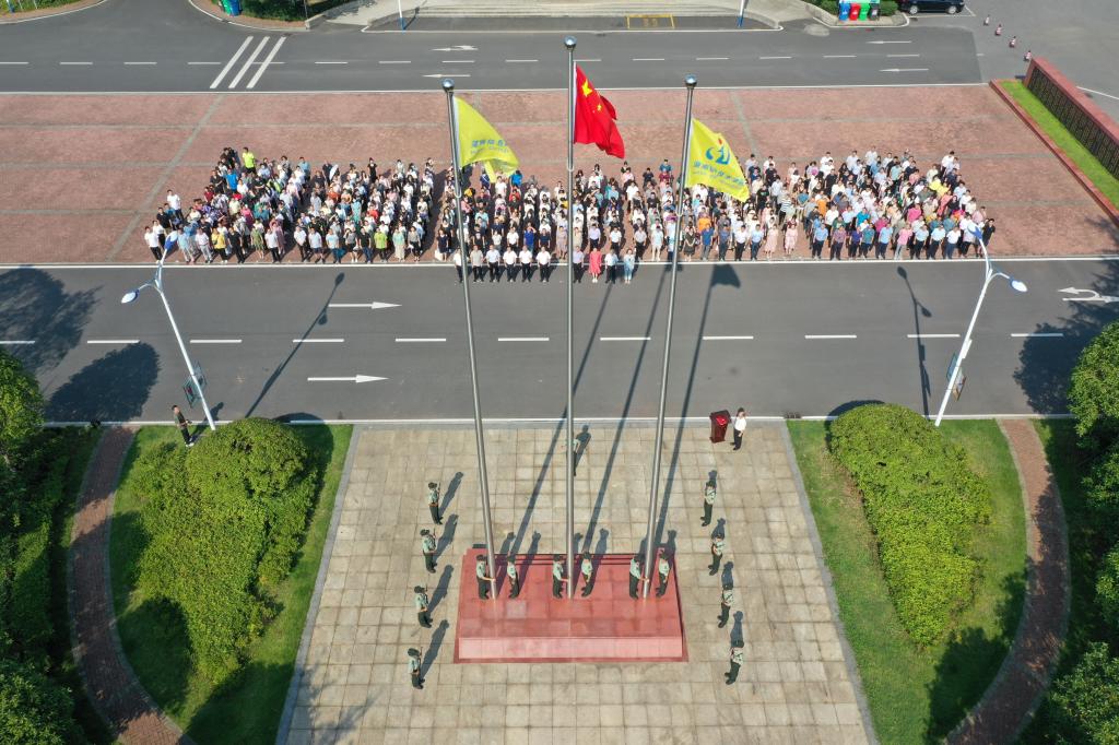 在全体教职工的注目礼下,英姿飒爽的国旗护卫队队员们护送鲜艳的五星红旗进场,伴随着庄严的中华人民共和国国歌,全体教职工在“家国共担、手脑并用”校训墙侧高唱国歌,深怀对祖国无限的热爱和崇高的敬意。