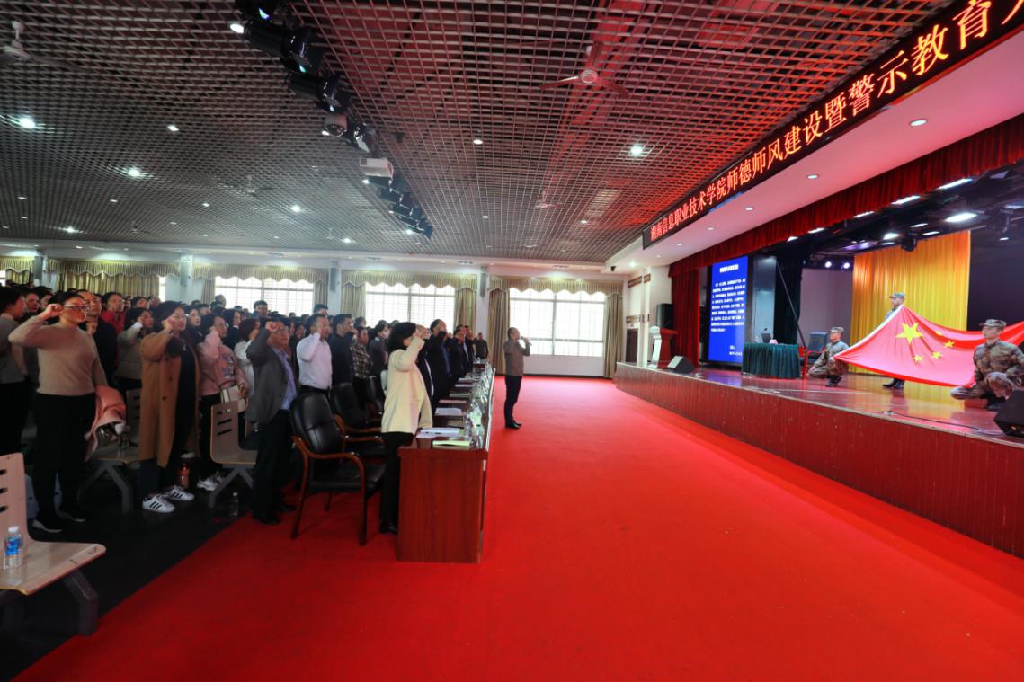 会上,全体教职工面对国旗,庄严宣誓:“忠诚党的教育事业,遵守法律法规,履行教书育人职责,引领学生健康成长……”通过宣誓,激励全体教师不忘初心,淡泊名利、崇德向善,树立教育情怀,提振“精气神”,铸造新时代师德、师风、师魂。