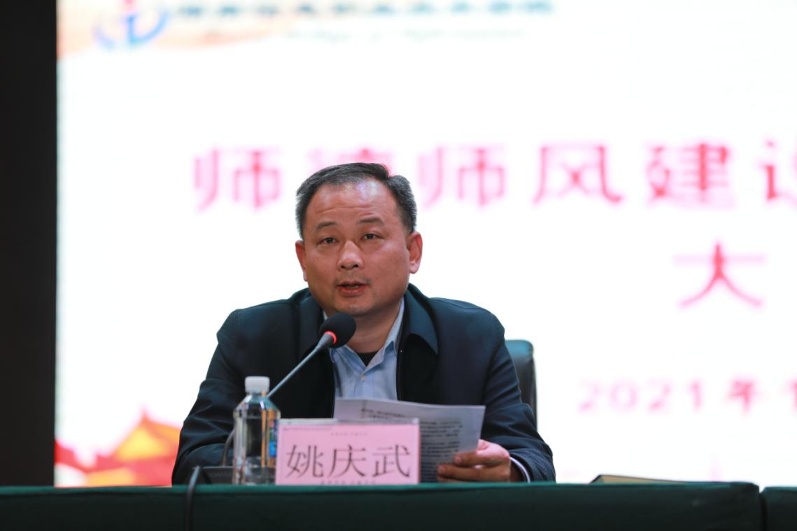 纪委书记姚庆武就师德师风建设及党风廉政建设和反腐败三个方面的问题作出了相关要求。他强调,全体教职工要坚定理想信念,增强纪律观念,自觉学习、严格遵守党和国家的各项法律和各项政策规定,要坚决守住底线,远离红线,任何时候都不能逾越高压线;党员干部要认真履行好“一岗双责”的责任,在做好各项工作的同时,按照“谁主管,谁负责,一级抓一级,层层抓落实”的责任制要求,把党风廉政建设、反腐败工作和师德师风建设落到实处。