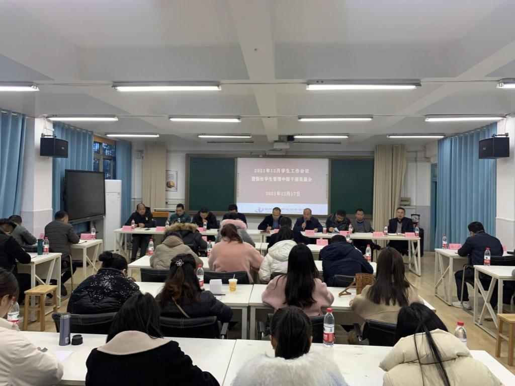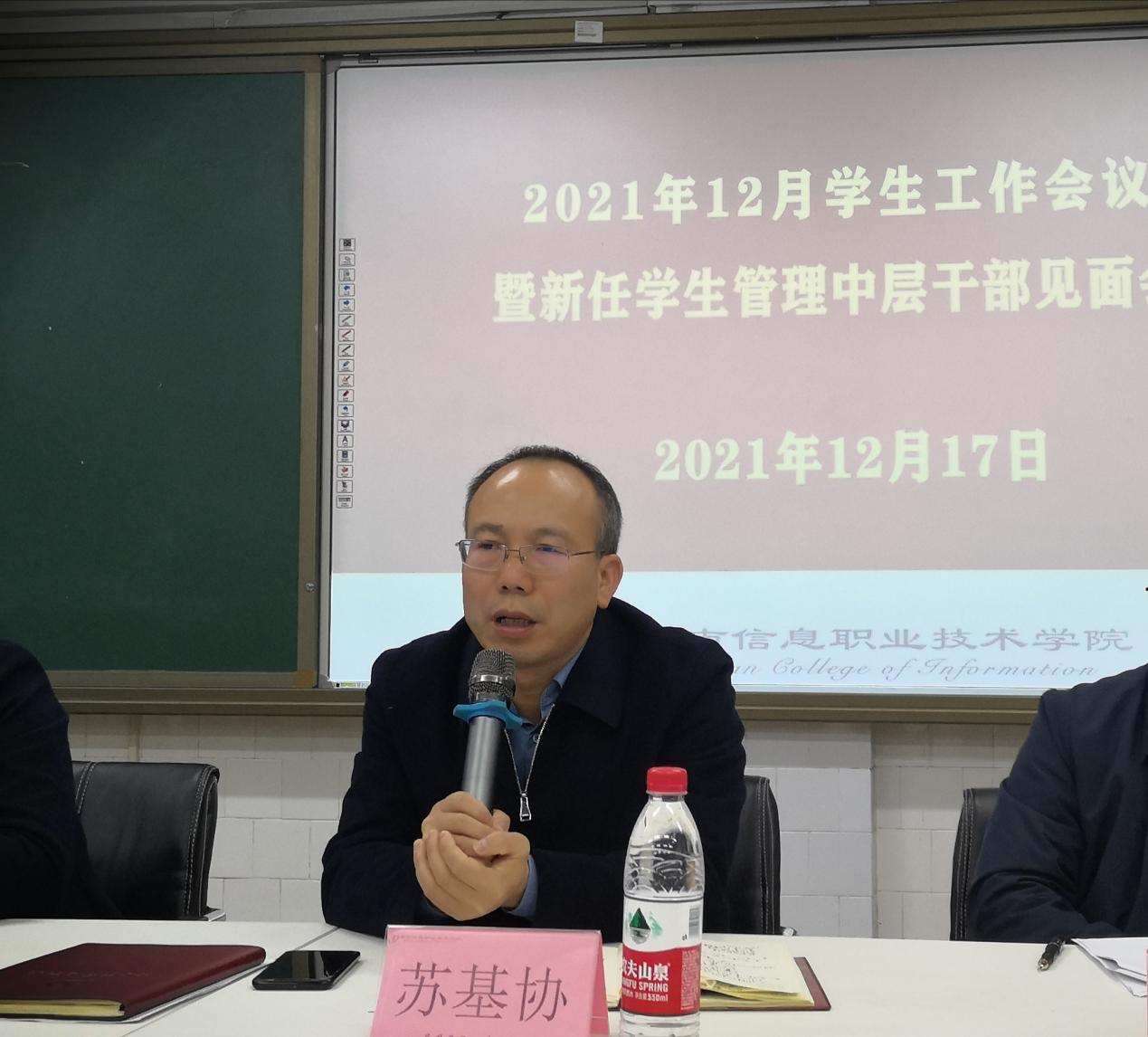 12月17日,学院召开2021年12月学生工作会议暨新任学生管理中层干部见面会。党委副书记苏基协出席,学生工作处、院团委中层干部,各二级学院党总支书记、副书记及全体专兼职辅导员100余人参加会议。