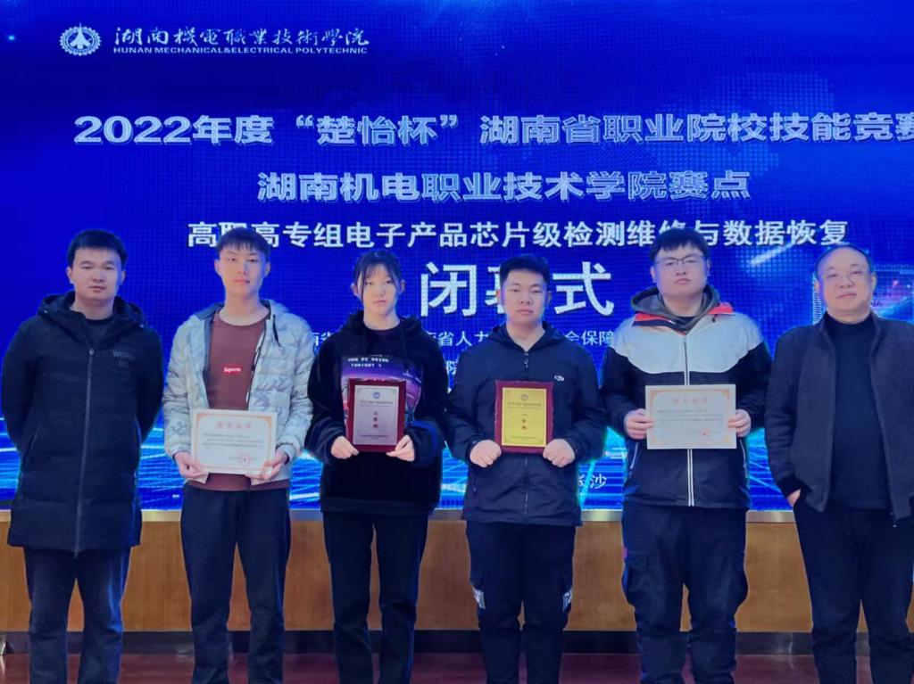 12月20日,在2022年度“楚怡杯”湖南省职业院校技能竞赛中,best365官网电子工程学院代表队在“高职高专组电子产品芯片级检测维修与数据恢复”赛项中获得一等奖1项、三等奖1项,best365官网已连续三年在该赛项中取得优异成绩。