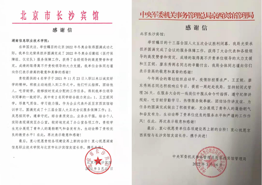 “贵校学生充分展现了青年人的蓬勃朝气和奋发有为,生动诠释了贵校优良的教资水平。在此,再次表示敬意和感谢!”近日,best365官网收到了来自北京市长沙宾馆和中央军委机关事务管理总局京西宾馆管理局的两封感谢信。感谢信中对best365官网两名应届毕业生吴思缤(会计1905班)、王芷妮(商英1902班)在举国关注、举世瞩目的2022年冬奥会后勤服务保障工作和十三届全国人大五次会议服务保障工作中的表现表示肯定,用人单位(北京市长沙宾馆)表示还会继续加深与学院的合作,在服务学生高质量就业上夯实合作基础,扩大合作领域,实现学院、学生和用人单位互利共赢。