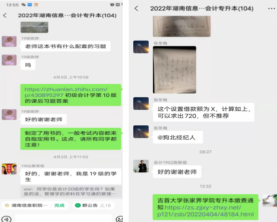 会计专业教师张冬梅、邓亚馨、赵薇在微信群内为学生答疑