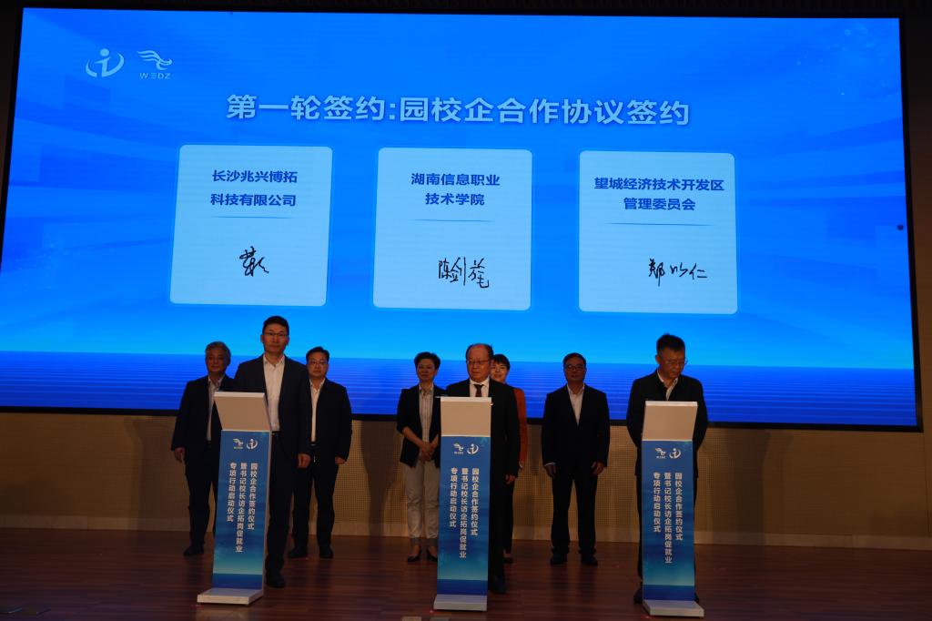为健全毕业生市场化、社会化的就业创业工作机制,拓展毕业生就业创业渠道,落实《湖南省高校书记校长访企拓岗促就业专项行动实施方案》,加强校企交流合作,5月12日上午,在湖南省教育厅、长沙市人民政府、望城经开区管委会的指导下,best365手机版官方网站“书记、院长访企拓岗”促就业专项行动启动仪式暨园校企合作协议签约仪式在望城区经开区管委会举行。