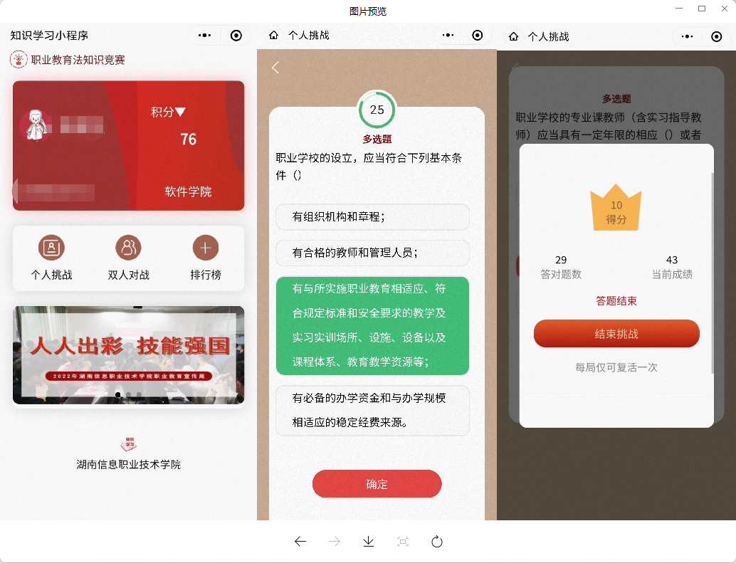 “可以和老师同学们一起开发一款面向全校师生的新修订的《中华人民共和国职业教育法》知识学习竞赛小程序,感到非常荣幸,觉得自己在母校学习的专业技能可以派上用场了,经过十几天的设计、开发、测试,解决了种种问题后,小程序终于上线和大家见面了,我收获颇丰……”软件1914班张志宇同学开心地说道。