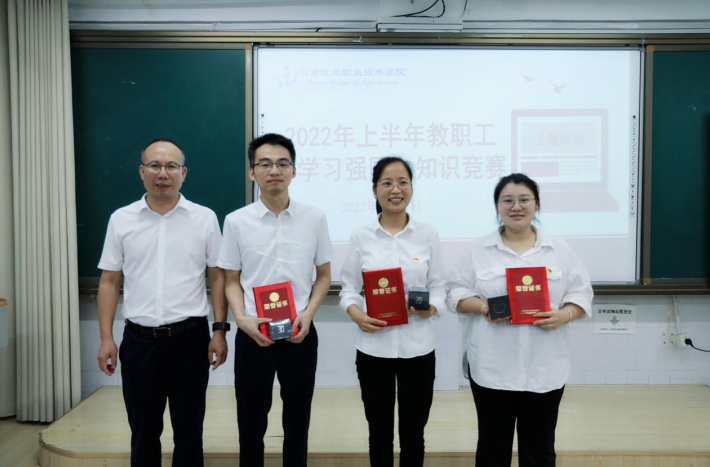 此次比赛分初赛、复活赛和决赛,竞赛题目内容出自“学习强国”平台知识。经过初赛和复活赛环节的比拼,最终有4支队伍脱颖而出,进入到决赛阶段。决赛由参赛选手通过手机“学习强国”APP“挑战答题”栏目进行答题。比赛现场,参赛队伍严阵以待,两分钟倒计时开始后,在共享屏幕上挑战答题,每队选手分秒必争,谨慎作答。其他观赛队伍积极观战,不时传来欢呼和赞叹声,参赛队伍的快速反应、完美作答、精彩抗衡使得现场高潮迭起。最终,经济管理学院党总支以默契的团队协作赢得决赛。经过激烈的角逐,本次比赛共评选出一等奖1名、二等奖3名、三等奖6名,学院党委副书记苏基协为获奖队伍颁奖。