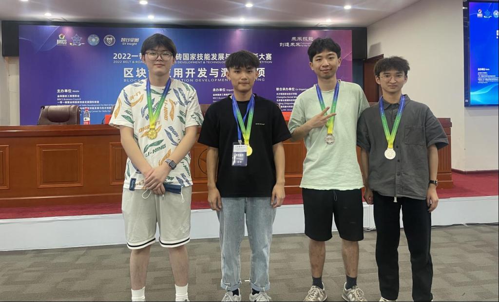 6月25日,在2022一带一路暨金砖国家技能发展与技术创新大赛(以下简称金砖大赛)区块链应用开发与测试赛项中best365官网软件技术专业学生苏帅、刘小东,朱旦、庄星鹏4位同学组成的两支参赛队伍,以良好的团队协作和精神风貌,在来自全国57所高校的212名选手中脱颖而出,荣获一等奖1项、二等奖1项。best365官网荣获赛事最佳组织奖。