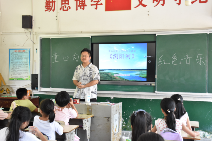 “浏阳河,弯过了几道弯,几十里水路到湘江…”“我和我的祖国,一刻也不能分割”,音乐课堂上响起激昂的曲调,教唱、合唱、独唱、对唱,唱出了对家乡和祖国的无限热爱。志愿者讲述歌曲背后的故事,带领着67名小学生进入了“童心向党”的红色音乐课堂,追寻红色记忆、感悟革命精神、汲取奋进力量,奏响实现中华民族伟大复兴的乐曲。