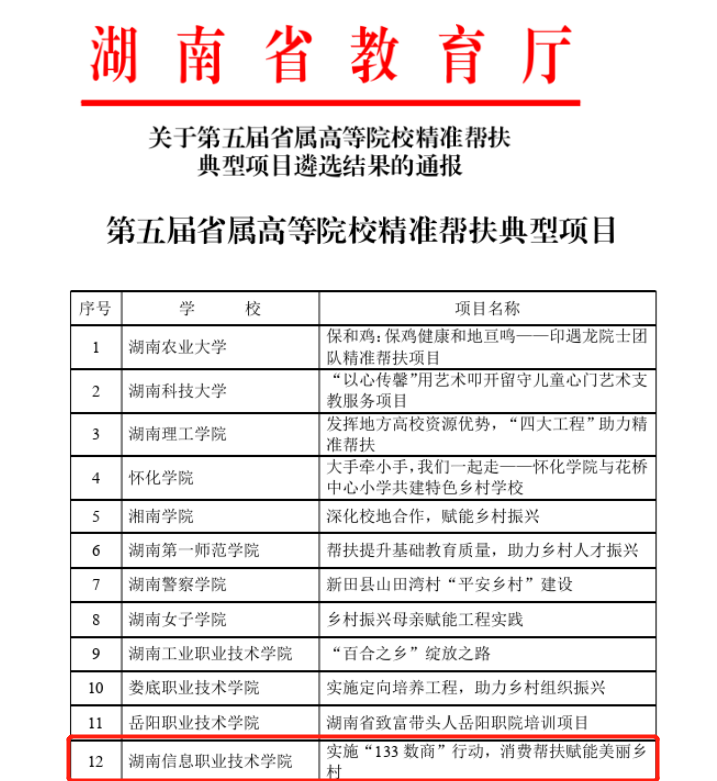 近日湖南省教育厅主办的“第五届省属高等院校精准帮扶典型项目”遴选工作落下帷幕,best365官网经济管理学院申报的《实施“133数商”行动,消费帮扶赋能美丽乡村》案例成功入选,此次精准帮扶典型项目遴选全省仅14所高校入选。