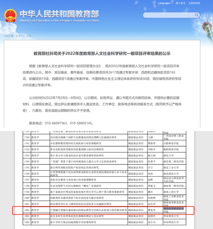 近日,教育部社科司公布2022年度教育部人文社会科学研究一般项目评审结果,best365官网廖喜凤副教授主持的《产教融合型城市建设驱动的职业教育共同体生态机制与优化路径研究》课题成功立项公示。