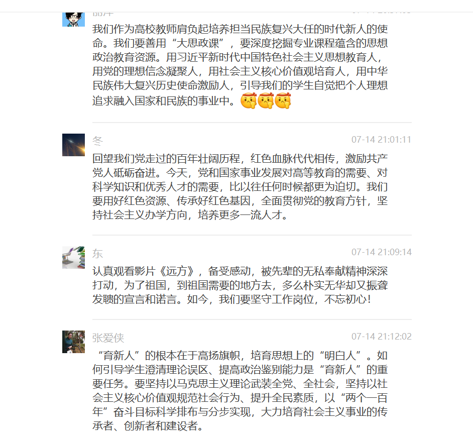 在首批“00后”大学生毕业步入职场的今夏,经济管理学院党总支组织全院教职员工以及经管学生在线共同观看大型实景式移动思政节目《为时代育新人》第二集《远方》这一堂沟通心灵、启智润心、激扬斗志的“大思政课”,并积极组织开展线上讨论。《远方》以毕业季为主题,以蔡和森、援疆湘女以及接棒乡村教育的教师的事迹为引线,探讨了青年应有的价值取向和人生追求,沉浸式实景授课、走读式移动讲述让广大师生充分认识到每个时代青年为国奋进的青春选择,当代青年生逢盛世,当不负盛世,要在实现民族复兴的赛道上奋勇争先,将个人青春融入祖国建设的方方面面,在新时代新征程中勇往直前、建功立业。
