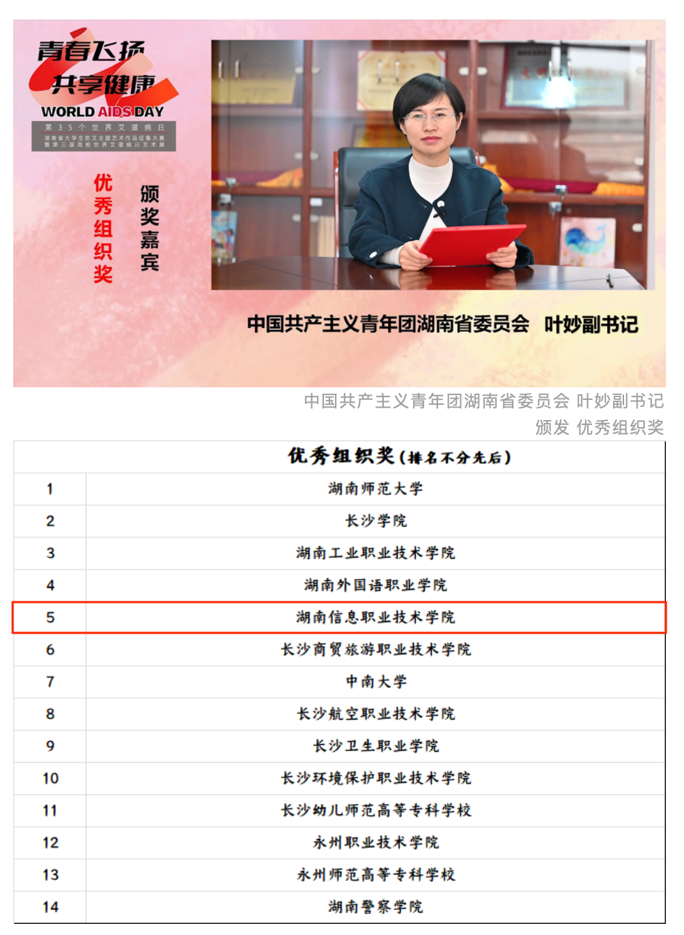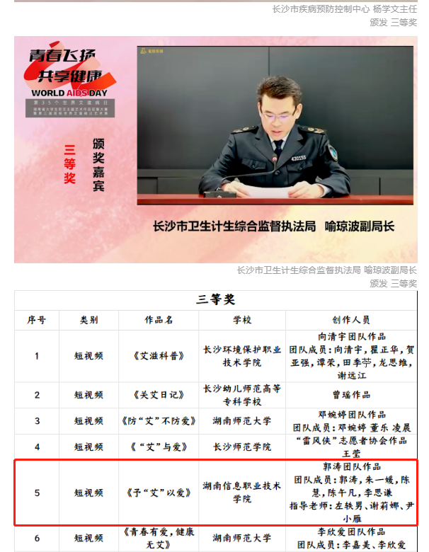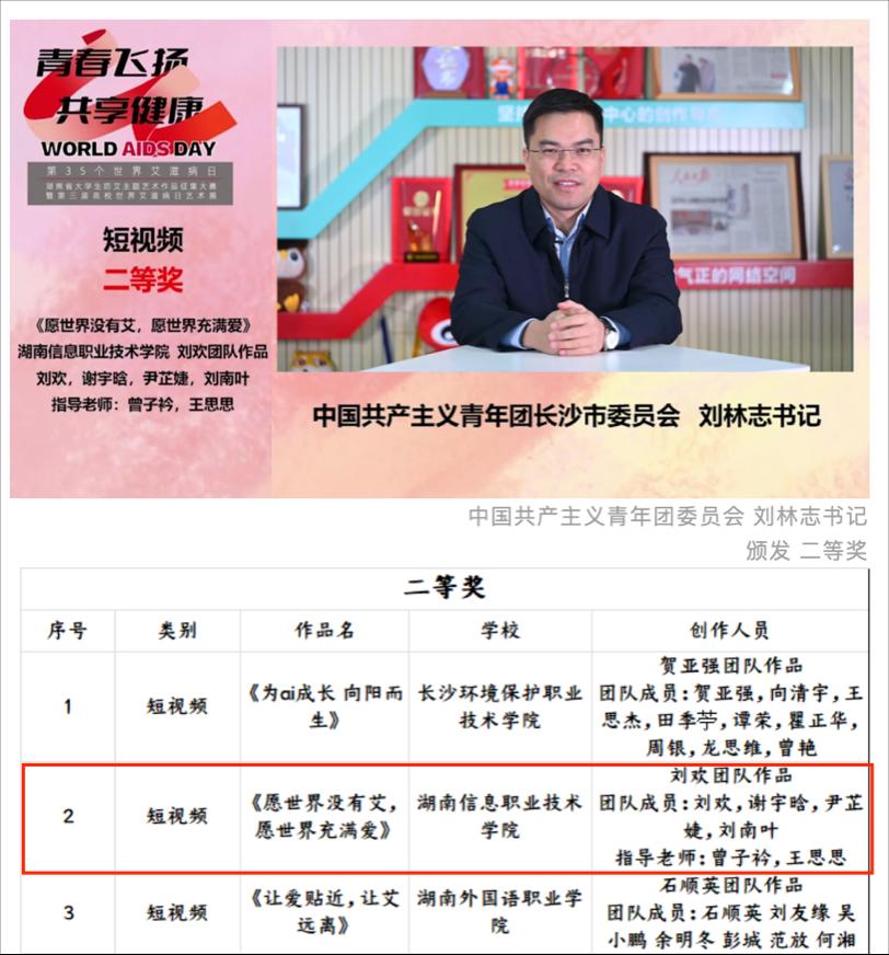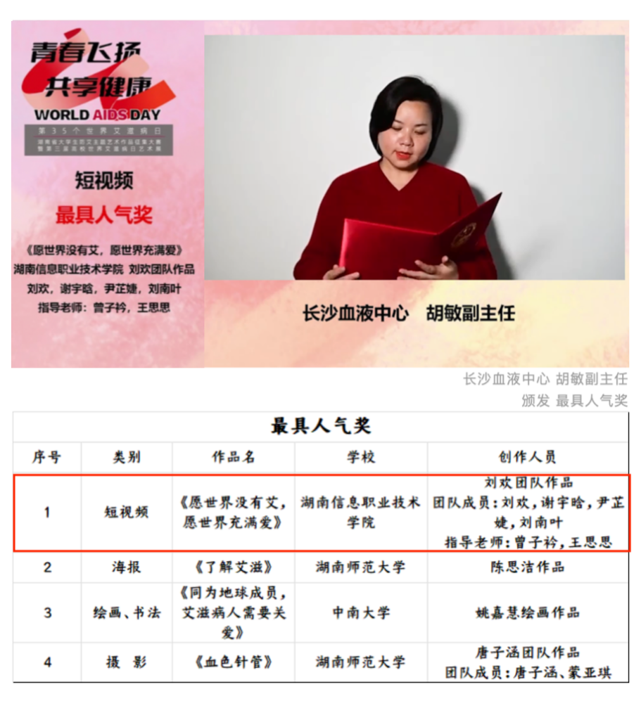 12月1日,是第35个世界艾滋病日。长沙市仁一红丝带健康促进中心为做好艾滋病防治公益宣传活动,联合医院、高校、企业、公益组织,开展了“青春飞扬,共享健康” 2022年高校青少年防艾艺术作品征集大赛。best365官网自接到活动通知,于11月5号开始,广泛动员,积极开展防艾知识宣讲等主题教育活动,掀起了广大学生的创作热情,用心组织参赛备赛,通过专家评选与网络展示,best365官网选送的作品《愿世界没有艾,愿世界充满爱》获二等奖、最具人气奖,《予“艾”以爱》获三等奖,学院获优秀组织奖。通过活动对加强青年学生的自我教育、提高防艾认知等方面发挥了重要的作用,增强了学生的防艾意识。