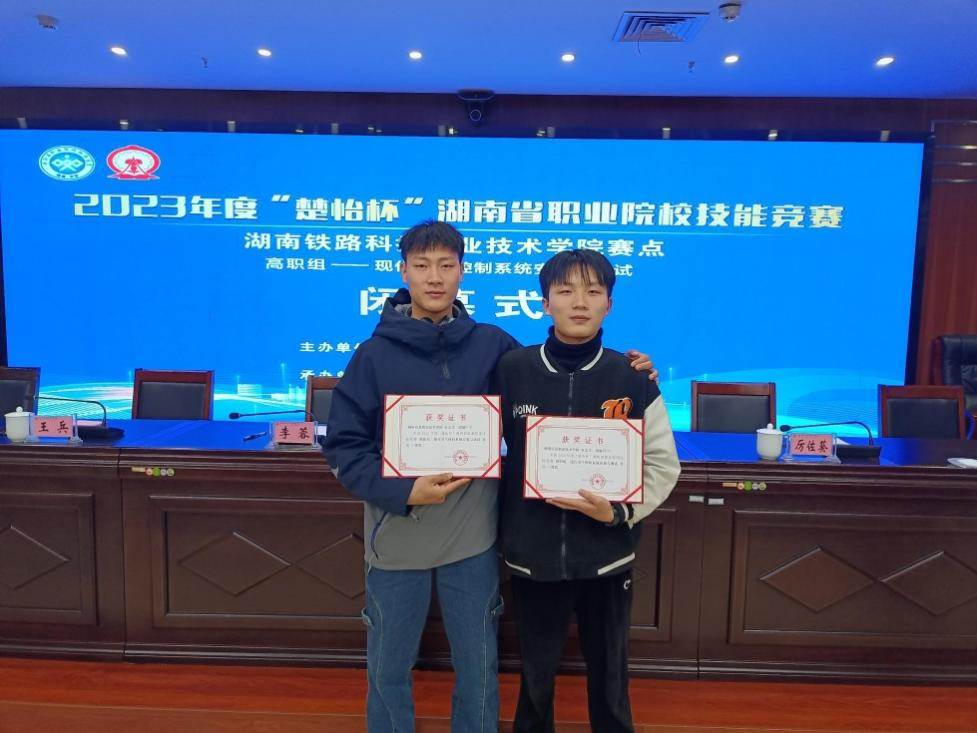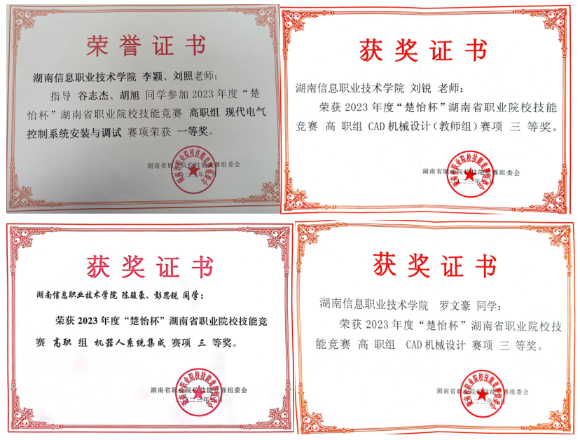 2023年“楚怡杯”湖南省职业院校技能竞赛赛场上捷报频传,best365官网机电工程学院一路过关斩将,取得优异成绩。分别荣获了现代电气赛项一等奖1项、CAD机械设计赛项、机器人系统集成赛项三等奖各1项,CAD机械设计赛项教师组三等奖1项,实现所有参赛赛项100%获奖。特别是“现代电气控制系统安装与调试”赛项实现了历史性突破,在强手如云的32支参赛队伍中,斩获一等奖。
