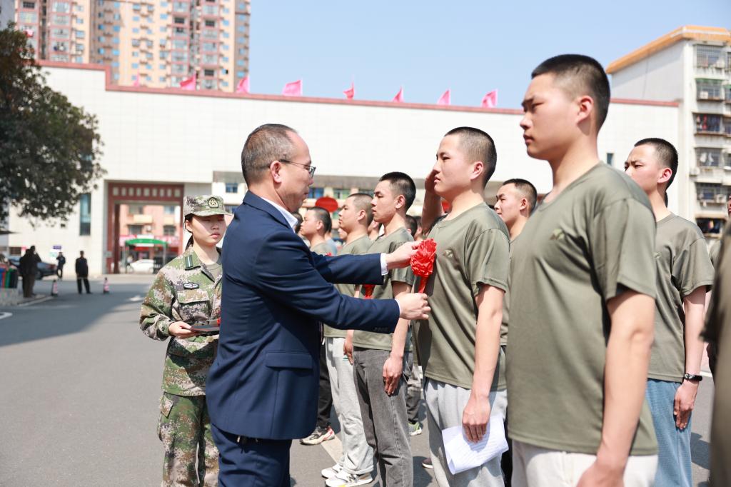 欢送仪式上,与会领导老师为应征入伍学生佩戴参军光荣大红花,并为同学们送上祝福和寄语。