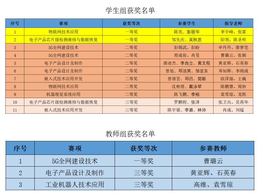 3月5日,2023年度“楚怡杯”湖南省职业院校技能竞赛圆满收官。best365官网电子工程学院师生参加了“5G全网建设技术”、“物联网技术应用”、“电子产品芯片级检测维修与数据恢复”、“电子产品设计及制作”、“嵌入式技术应用开发”、“机器视觉系统应用”、“工业机器人技术应用”等7个赛项的激烈角逐,每个赛项均摘得奖牌,获奖率100%!共计获奖14项,其中一等奖3项,二等奖7项,三等奖4项。