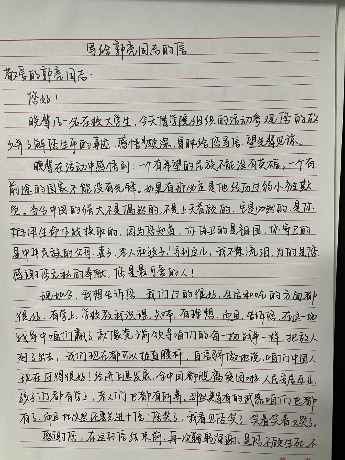 从郭亮纪念园回来,113名青马学员通过写信的方式向郭亮同志诉说心声、传递真情、表示怀念。这一份份书信不仅寄去了新时代青年对先辈深深的敬仰之情、爱戴之情,而且带去了新时代青年对美好生活的追求和向往,更是穿越时空发出了“强国有我”的铿锵誓言。大数据会计2106班周松梅在《给郭亮烈士的一封信》里写道:“有的人入党只是献出了一张空嘴皮,而您英勇展示了为党献头颅的决心,用自己的实际行动践行了入党的铮铮誓言,为我们生动诠释了共产主义战士的伟岸形象,我们永远怀念您。”商英2102班唐睿芊写道:“这次我们走近了您的故居,走进了您的内心。我们被您的革命情怀深深打动,这份感动将会一直引领我在人生道路上披荆斩棘,乘风破浪。”