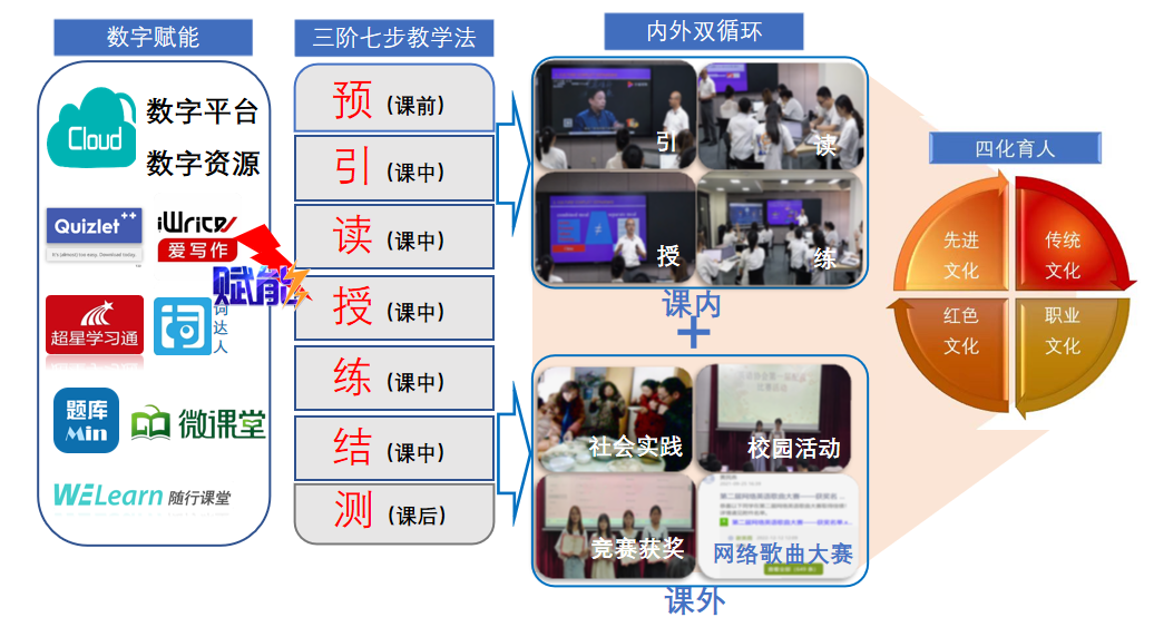 习近平总书记在党的二十大报告中指出:“推进文化自信自强,铸就社会主义文化新辉煌,要以社会主义核心价值观为引领,发展社会主义先进文化,弘扬革命文化,传承中华优秀传统文化,不断提升国家文化软实力和中华文化影响力。”best365官网基础课部高职英语课程教学团队学习贯彻党的二十大精神,以立德树人为根本目的,充分利用自建的丰富的英语数字资源,将优秀传统文化和社会主义先进文化、红色文化和职业文化(“四化”)融入教学内容,通过“三阶七步”教学模式积极探索高职英语课程育人新路径。