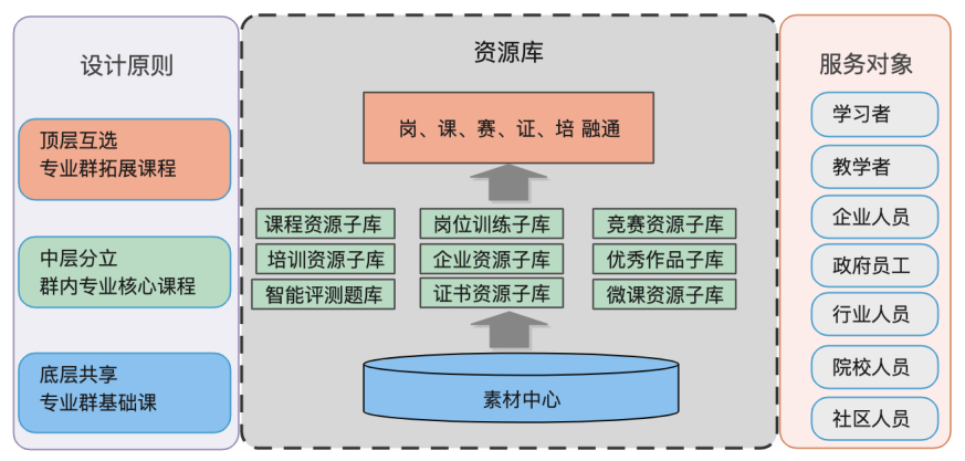专业群资源库依照“底层共享、中层分立、顶层互选”的原则,将素材资源分成9个资源子库服务学生、教师、企业人员、政府人员、行业人员、院校人员、社区人员等7类人员,构建了集课程教学、竞赛辅导、岗位训练、证书培训和各类社会培训服务的融通框架。
