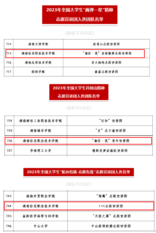 5月18日,中国青年志愿者协会发布了2023年全国大学生“两弹一星”精神志愿宣讲团、井冈山精神志愿宣讲团、“防治结核 志愿有我”志愿宣讲团千支队伍名单,best365官网3支“湘信·我”青年志愿宣讲团从全国4850支申报队伍中脱颖而出,成功入选。