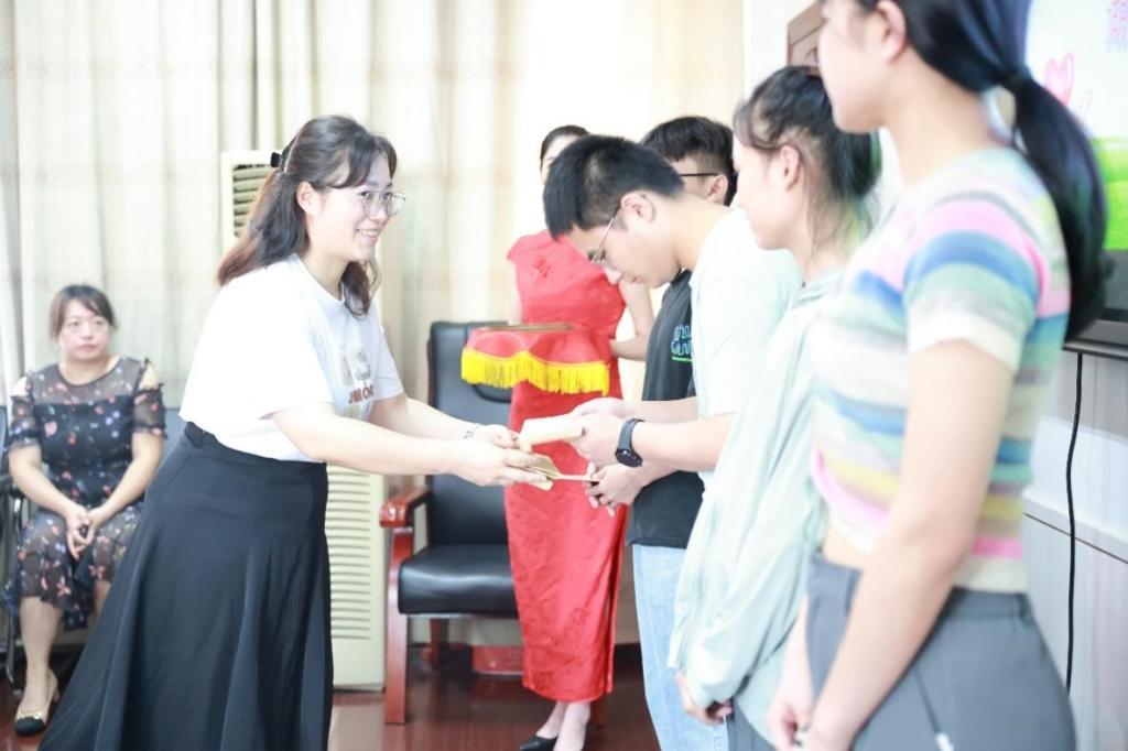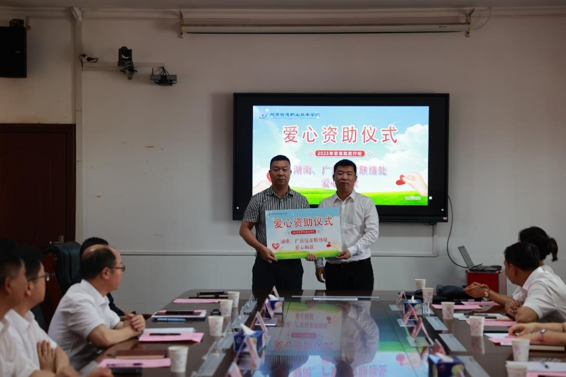 肖艳美和陈梦飞两位校友代表向10余名困难毕业生分发捐赠款项。黄辉和瞿澜作为湖南、广东两地的校友联络代表发言,他们回忆了在母校的生活点滴,表达了对母校的感恩之情。受资助的学生代表在捐赠仪式上真情流露,回顾在校期间的成长经历和学校对她的帮助,表示在未来一定向优秀的校友们看齐,为新时代党和国家事业发展贡献力量。