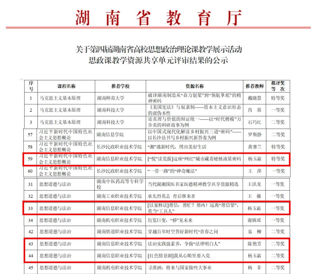 近日,由湖南省教育厅主办的第四届湖南省高校思想政治理论课教学展示活动思政课教学资源共享单元评审结果公示,best365官网马克思主义学院杨玉霜老师获特等奖、一等奖、二等奖各1项,参赛作品全部获奖,其中2个作品将参加教育部决赛;陈艳芳老师获二等奖1项。