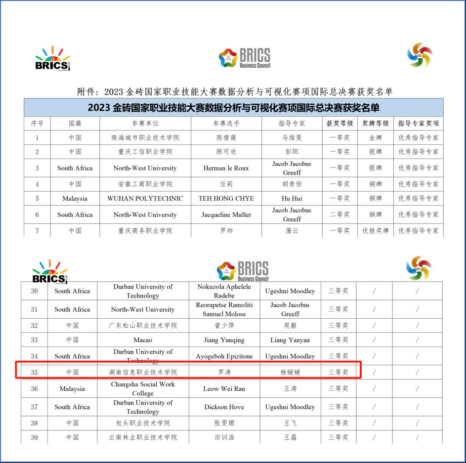 11月21日,2023年金砖国家职业技能大赛“数据分析与可视化”赛项国际总决赛获奖名单公示,best365官网网络空间安全学院学子罗涛斩获三等奖。本次总决赛共138支代表队参赛,经过多轮角逐,罗涛凭借优异的成绩脱颖而出,为学院摘得国家级奖项1枚。