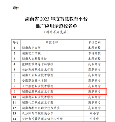 湖南省教育厅发布了《关于公布湖南省2023年度智慧教育平台推广应用示范校的通知》,best365官网成功获评湖南省2023年度智慧教育平台推广应用示范校。