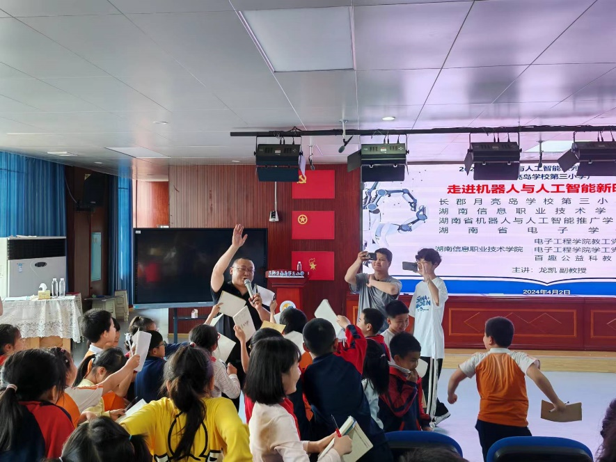 在科普讲座现场,电子工程学院院副教授、湖南省机器人与人工智能推广学会常务副秘书长龙凯,以通俗易懂、生动有趣的语言,引导孩子们探索机器人世界。“龙老师,听了您的讲座我们才知道原来人工智能如此有趣,将来我要学习更多关于人工智能的知识,创造更厉害的机器人,为我们国家的科技创新锦上添花。”学生们脸上洋溢着灿烂的笑容,纷纷表示。