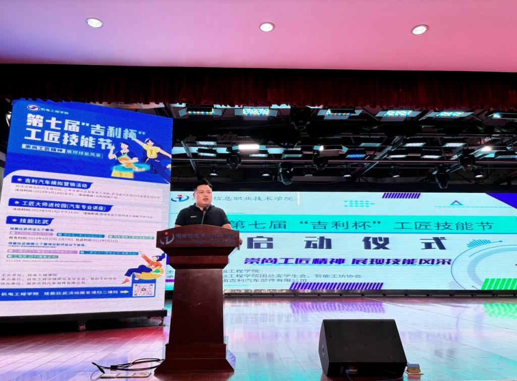 仪式现场,苏基协宣布第七届“吉利杯”工匠技能节正式开幕。机电工程学院负责人表示,工匠技能节活动的开展,是学生专业技能的有效展示,是对工匠精神的良好传承,同时也是深化校企合作的有效途径。要深入贯彻落实习近平总书记关于职业教育的重要指示精神,以“楚怡”职教精神为引领,不断深化职业教育创新改革,注重职业素养的养成与专业技能训练,为实现“以赛育人”的目标而不懈努力。刘磊表达了对本次技能节的支持和期待,并表示将持续开展校企合作,共同培养更多优秀的工匠人才。