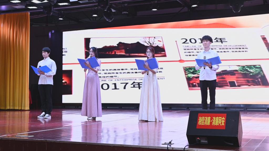 比赛现场,8位青年学子依次登台演讲,以真挚昂扬的情感表达了自己对全面从严治党、党风廉政建设以及校园廉洁文化建设的解读与感悟,展现了新时代高校学生勇担使命、积极奉献的优秀品质。现场,网络空间安全学院全体教师以一场情景交融的《家风颂》深刻表达了新时代教育工作者坚守教育初心的使命担当。