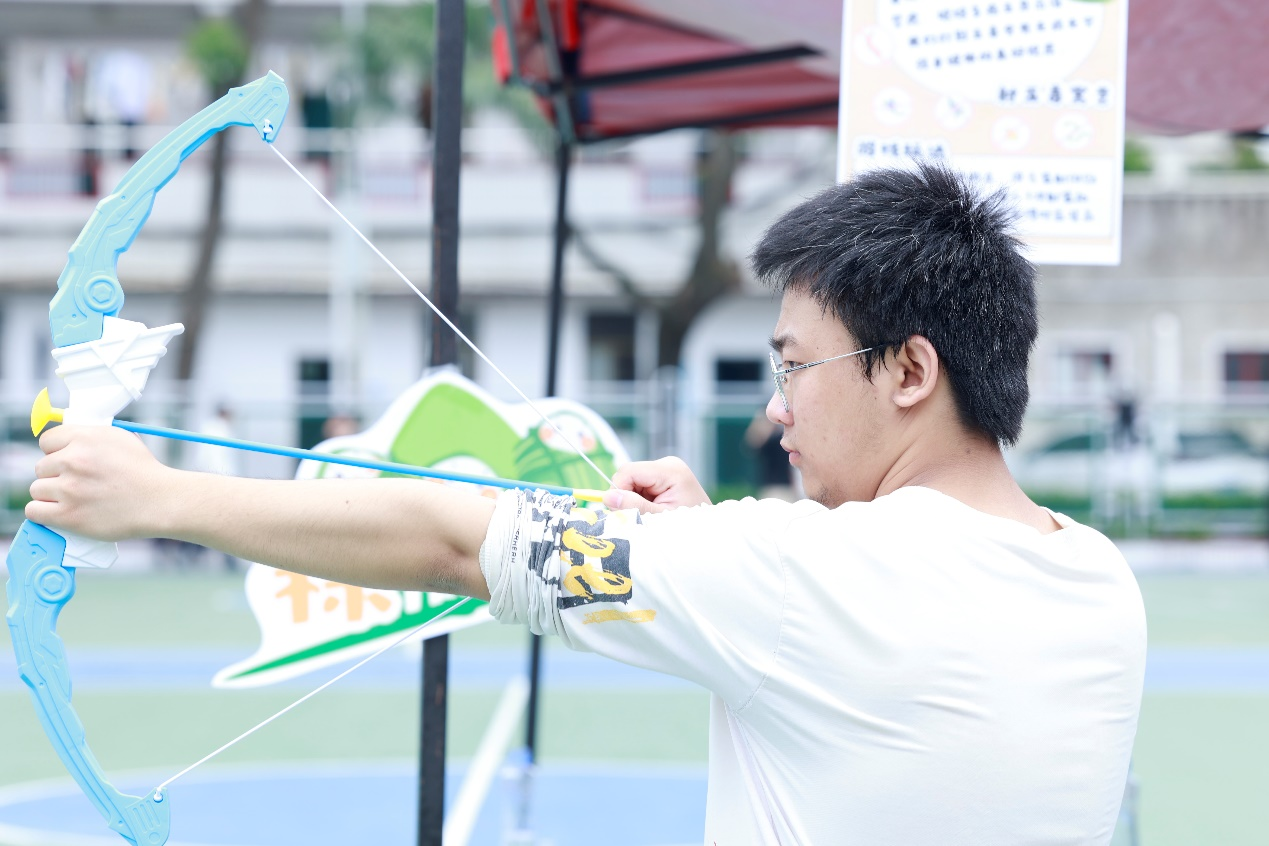 端午游园会一共设置三个区域,有手工区、游戏区和传统文化展示区。在手工区,师生体验了各种特色传统手工艺,如DIY艾草花束、编五彩绳、制作端午香囊。“这个活动,我有幸体验了古人在过节时丰富的传统习俗,我要把五彩绳带回家送给我的家人,借此表达祈福、纳吉的美好祝福”,参加编绳活动的周子珈和我们分享道。同时,趣味游戏区更是热闹非凡,投端阳古壶、粽子“保龄球”、射“五毒”、套“粽子”等游戏人气颇高,互动体验感十足。