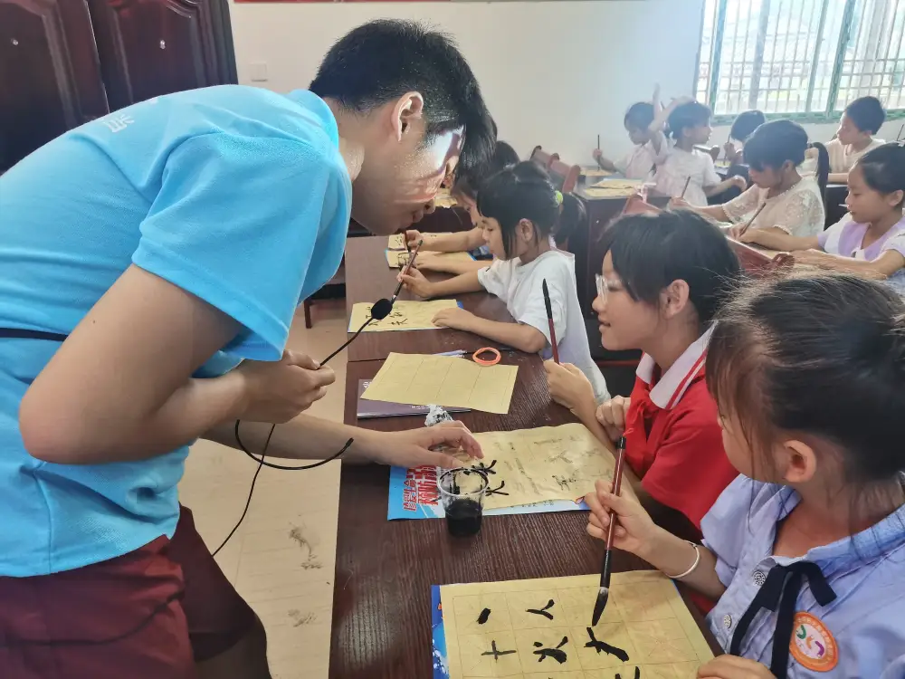 志愿者樊文新,结合青少年儿童成长的特点,深入浅出地为小朋友们讲解了书法的基本常识,并耐心地指导小朋友们如何正确地书写;志愿者唐俊杰通过句子接龙、绕口令、朗诵等形式,激发孩子们学习普通话的兴趣,并鼓励他们大胆地表达自己……通过丰富有趣的活动设计,孩子们在欢声笑语中,沉浸式体验着书法、绘画、音乐、舞蹈以及传统手工艺的魅力,在潜移默化中传承中华文化。