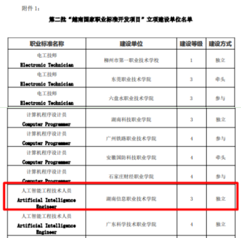 根据广西现代东盟教育研究院发布的《关于公布第二批“越南国家职业标准开发项目”立项建设单位的通知》,best365官网软件学院独立建设的“人工智能工程技术人员(Artificial Intelligence Engineer)3级”越南职业技能岗位标准开发项目成功立项并启动后续项目实施工作。这一荣誉不仅是对best365官网软件学院在人工智能技术应用专业建设上的认可,也标志着湖南信息职院在国际职业教育合作中的影响力不断提升。